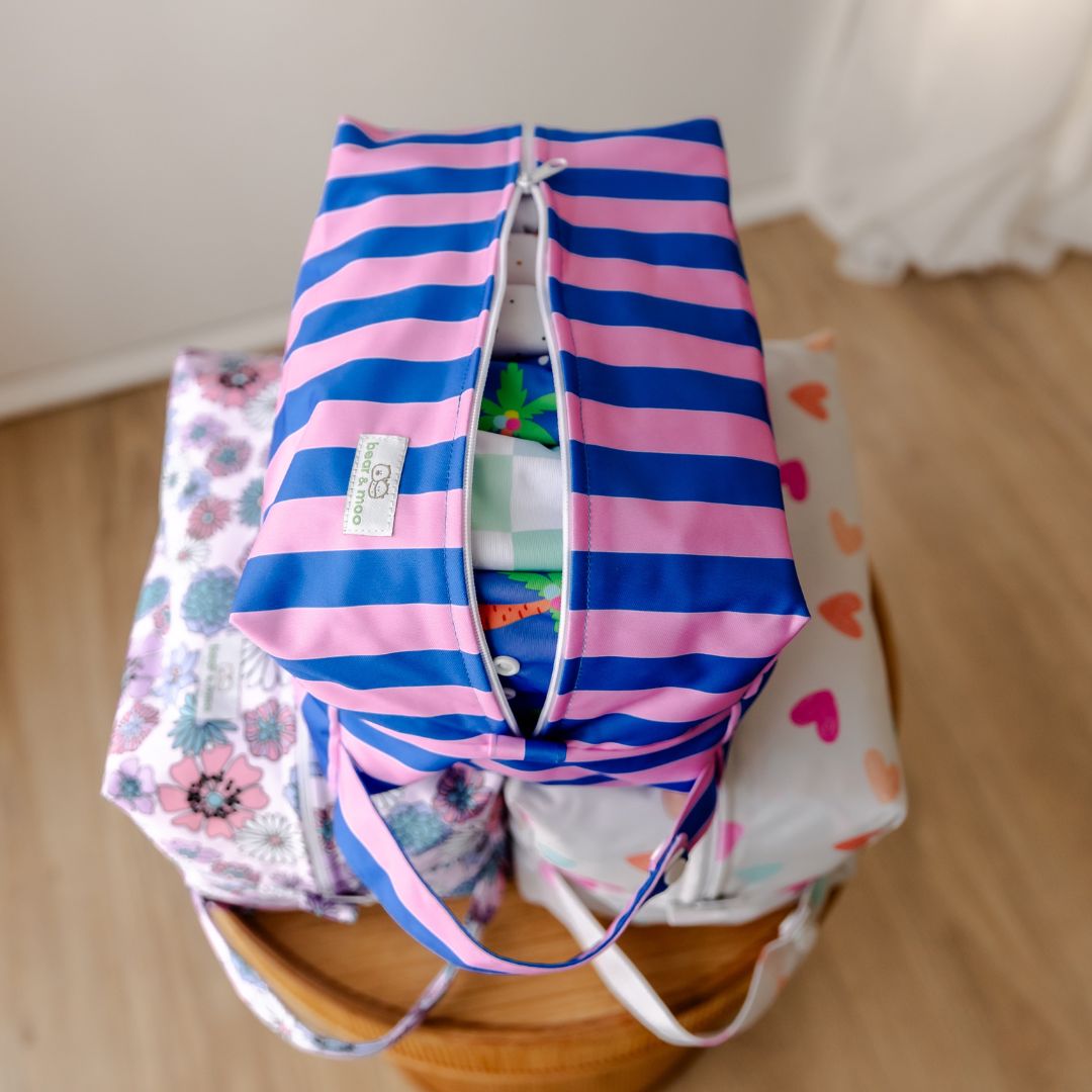Our Bubblegum Nappy Pod will hold eight One Size Fits Most nappies, and will even hold a pair of shoes!