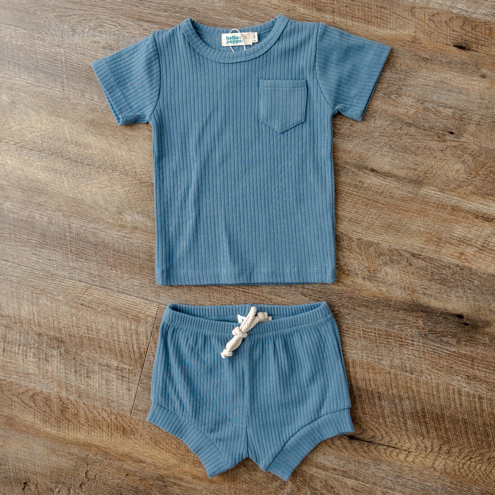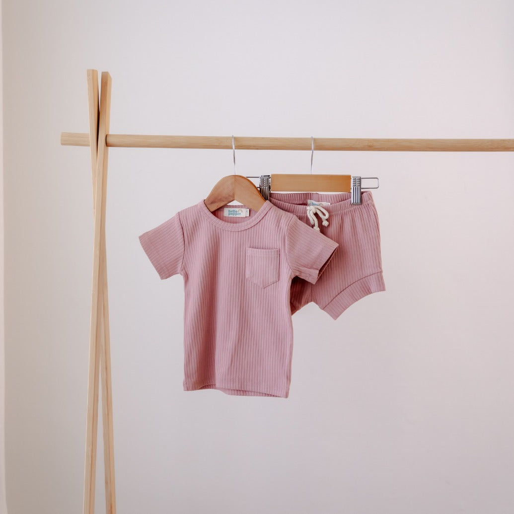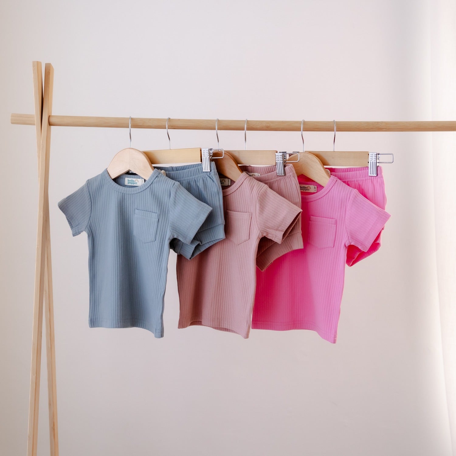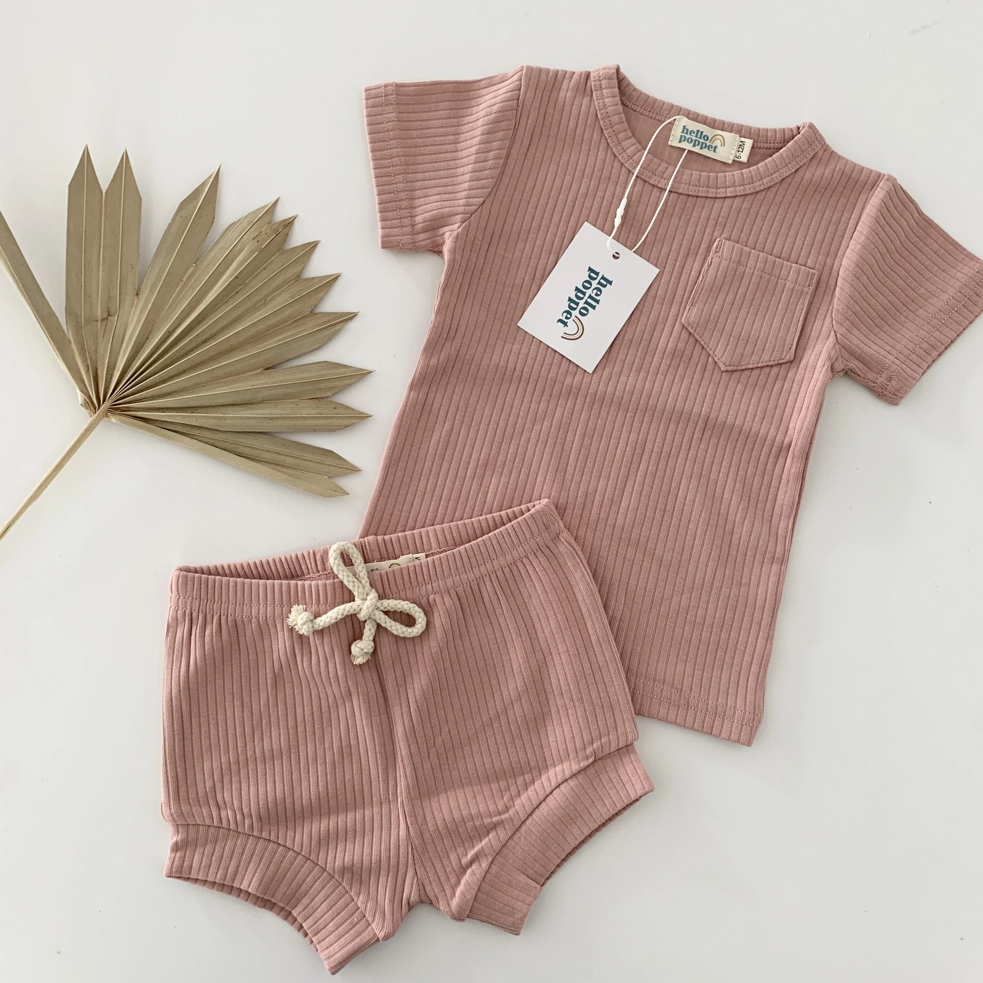 The Hello Poppet Alex Set is a two piece ribbed cotton set. It is soft and stretchy and all things practical. It has a beautiful (false) tie detailing so the set can be worn tucked or un-tucked. Perfect for summer days at the beach or trips to the playground.