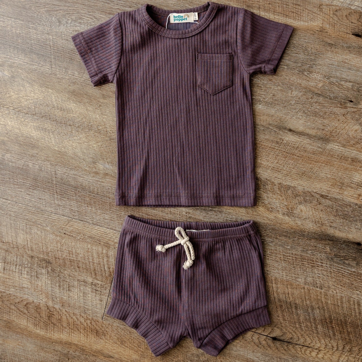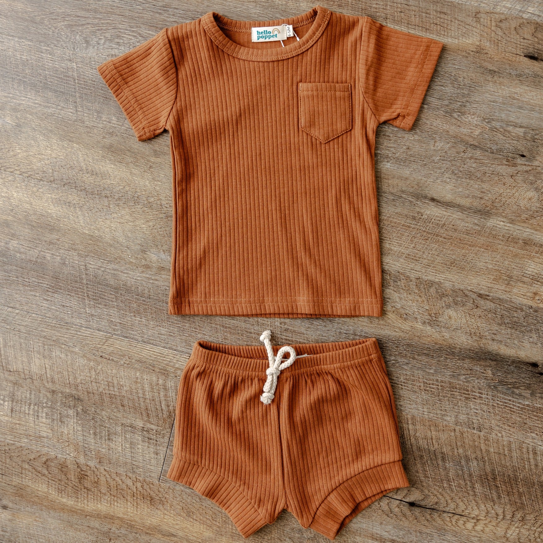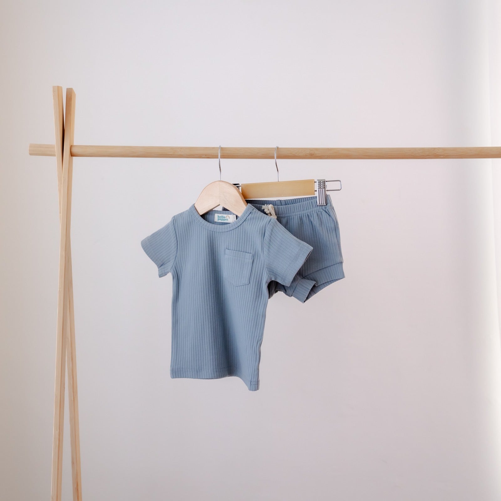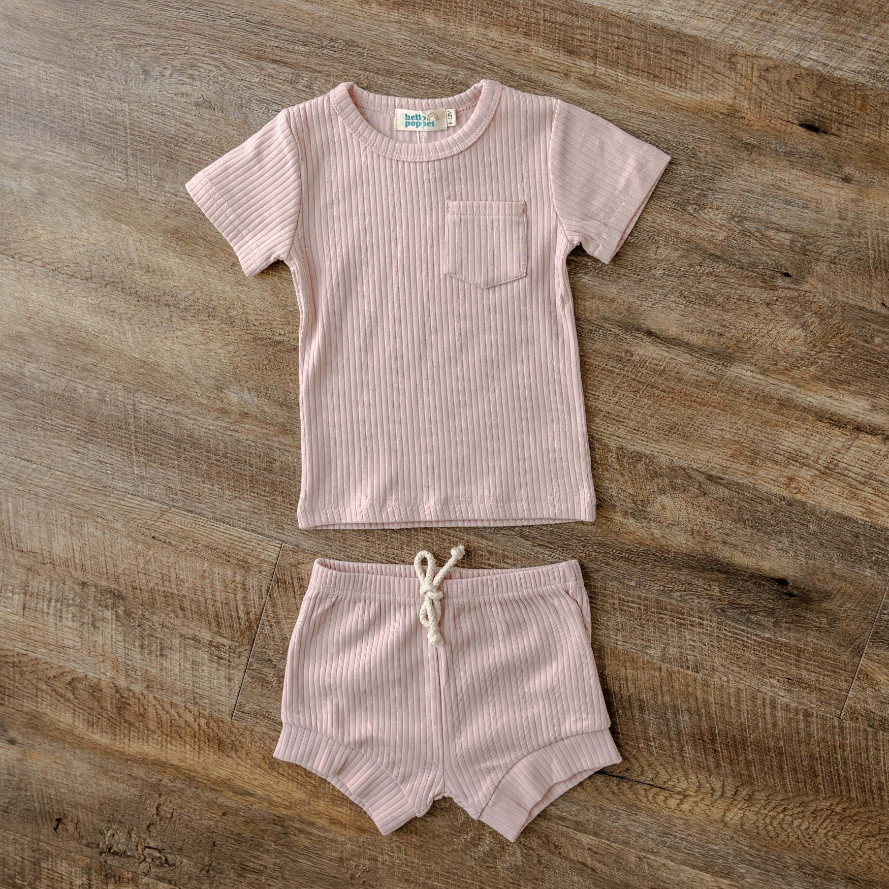 The Hello Poppet Alex Set is a two piece ribbed cotton set. It is soft and stretchy and all things practical. It has a beautiful (false) tie detailing so the set can be worn tucked or un-tucked. Perfect for summer days at the beach or trips to the playground.