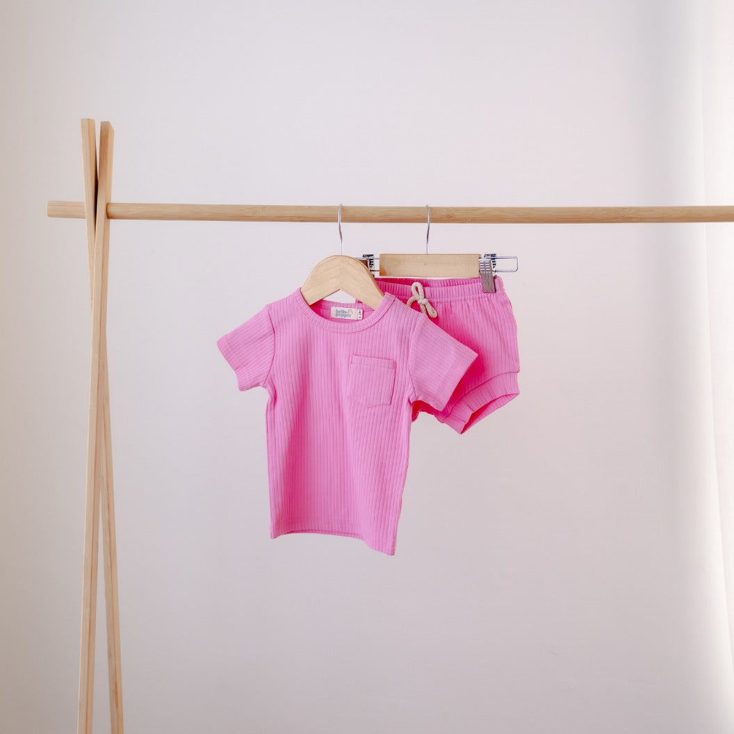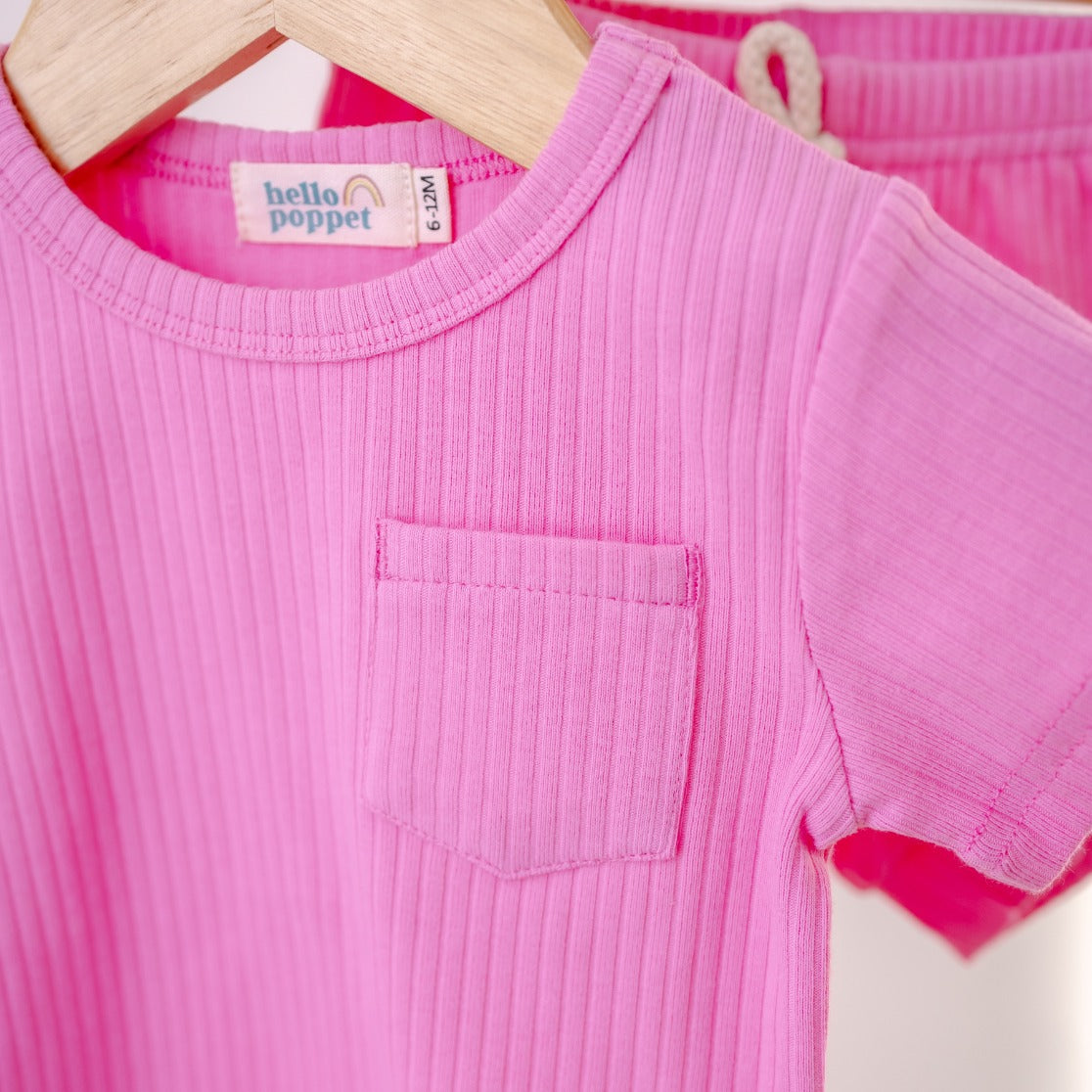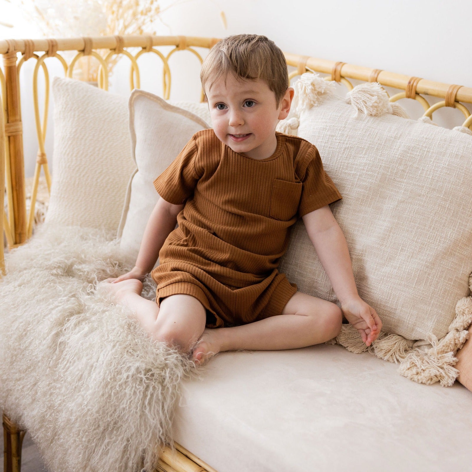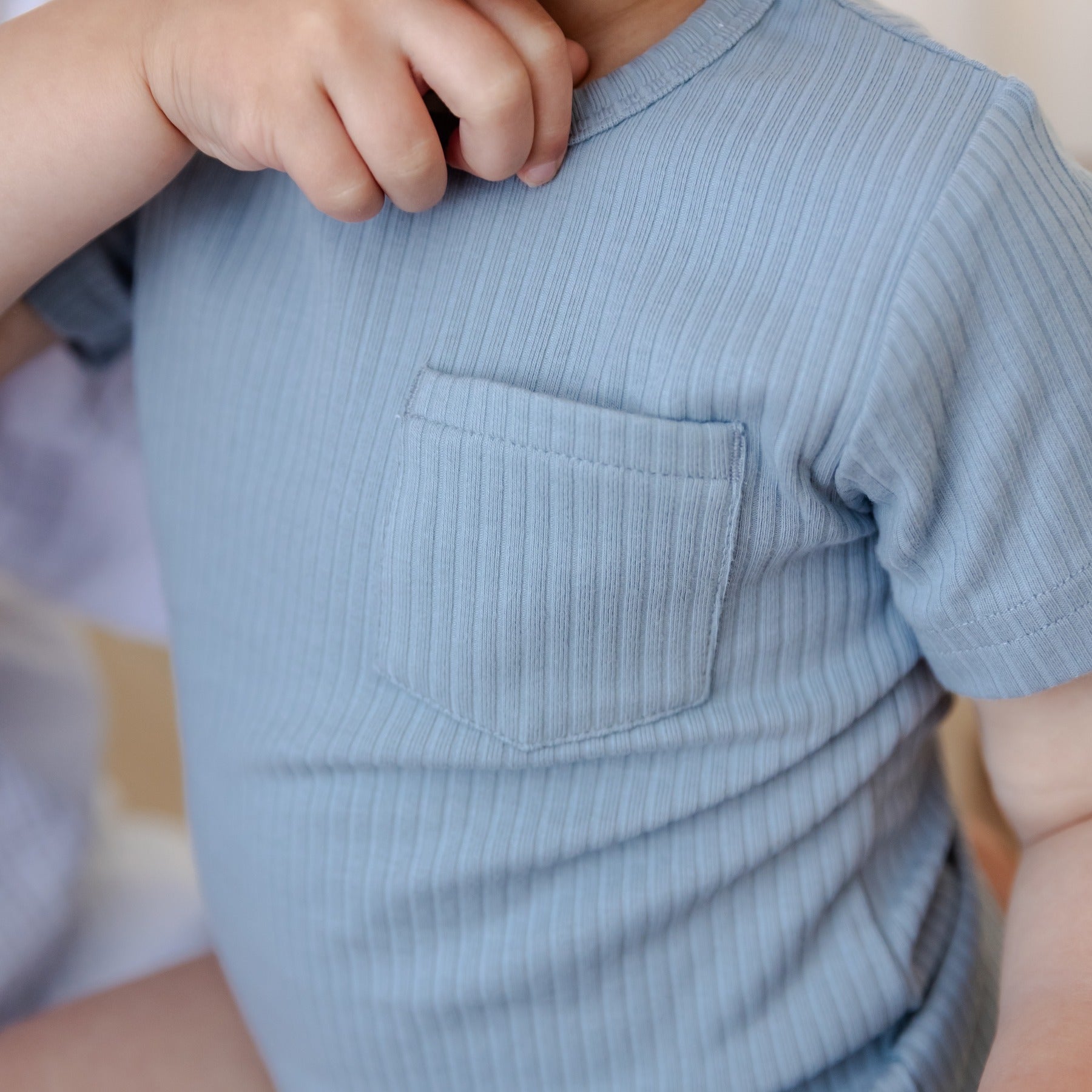 The Hello Poppet Alex Set is a two piece ribbed cotton set. It is soft and stretchy and all things practical. It has a beautiful (false) tie detailing so the set can be worn tucked or un-tucked. Perfect for summer days at the beach or trips to the playground.