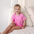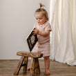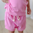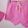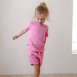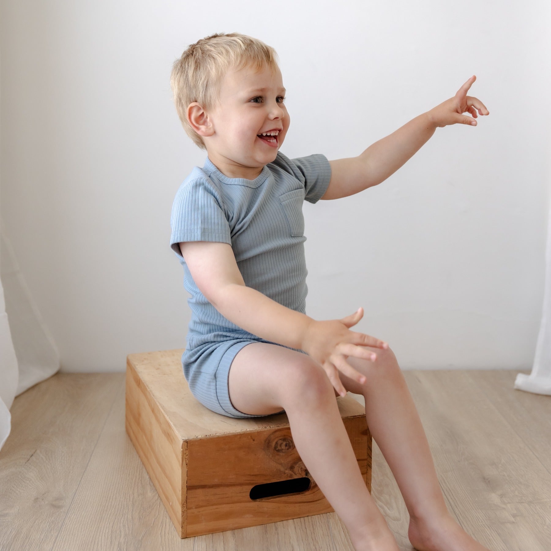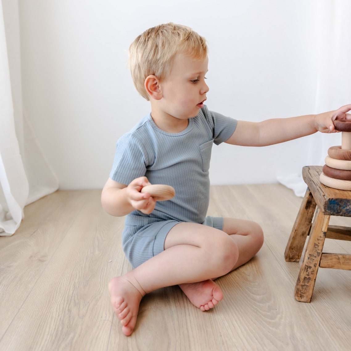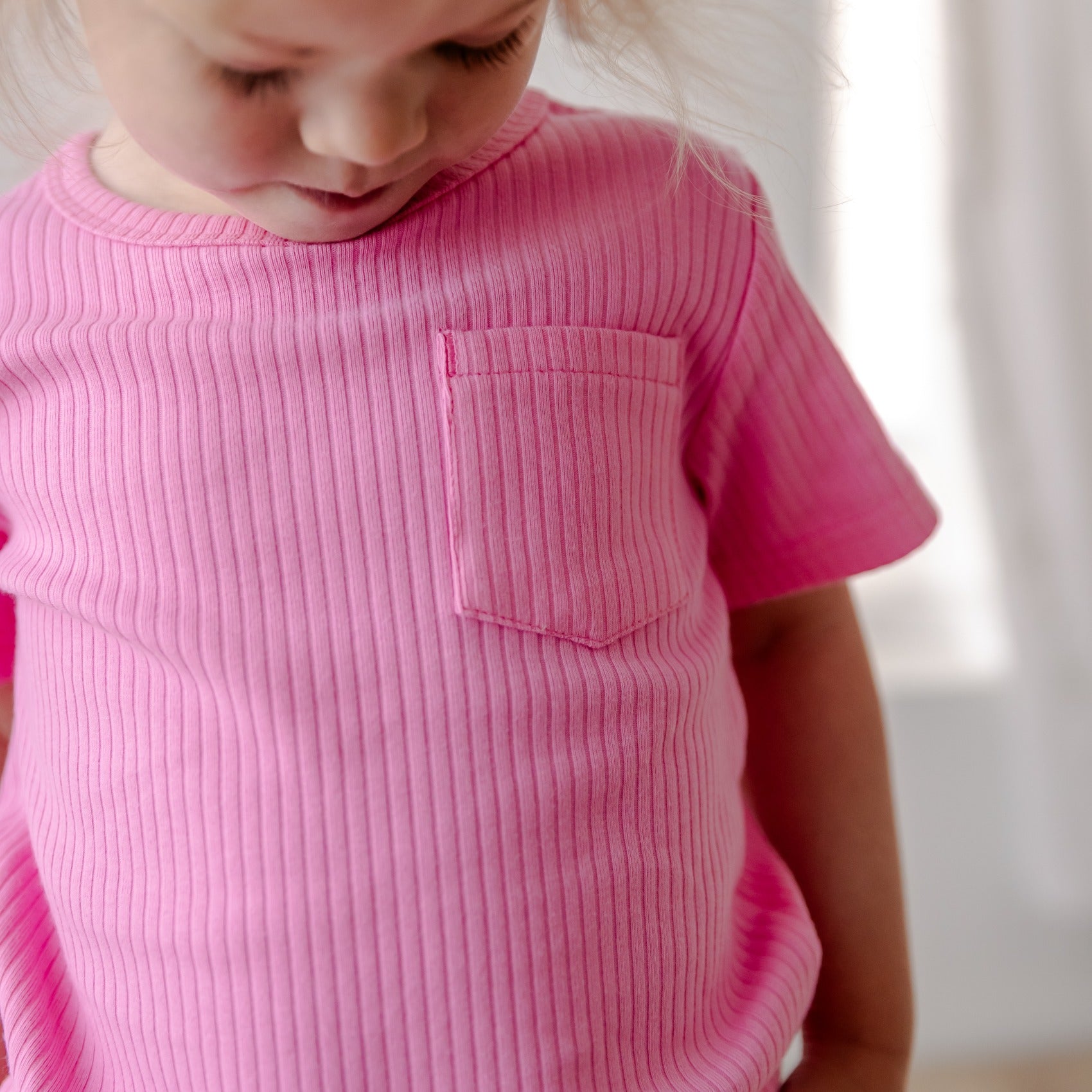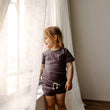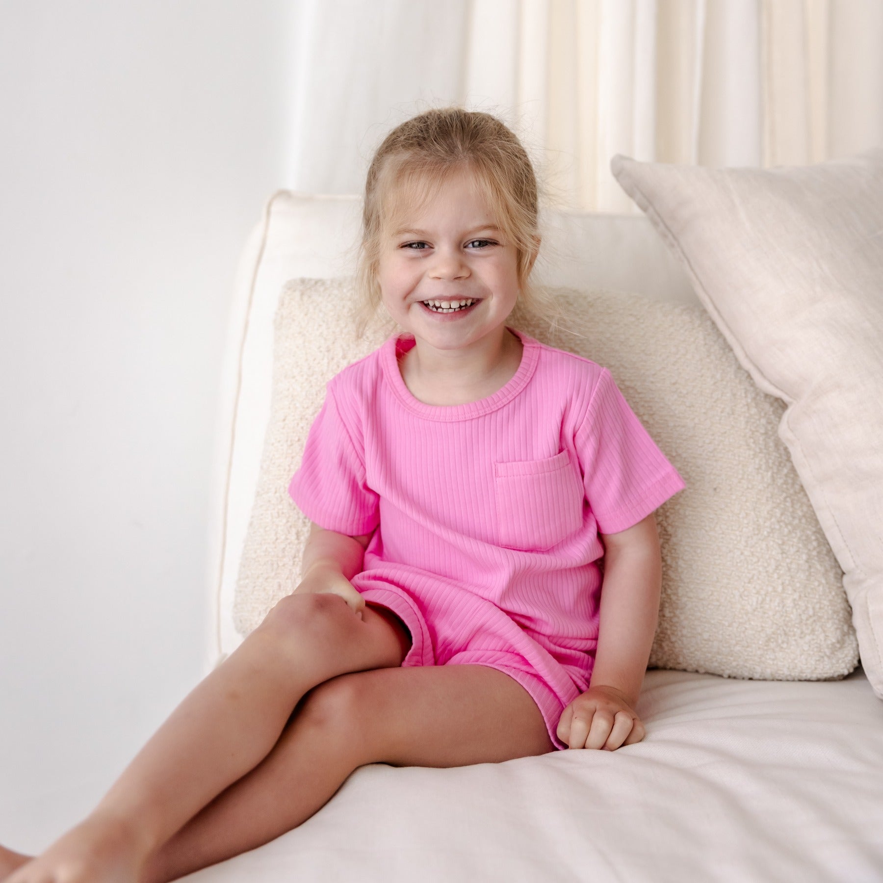 The Hello Poppet Alex Set is a two piece ribbed cotton set. It is soft and stretchy and all things practical. It has a beautiful (false) tie detailing so the set can be worn tucked or un-tucked. Perfect for summer days at the beach or trips to the playground.